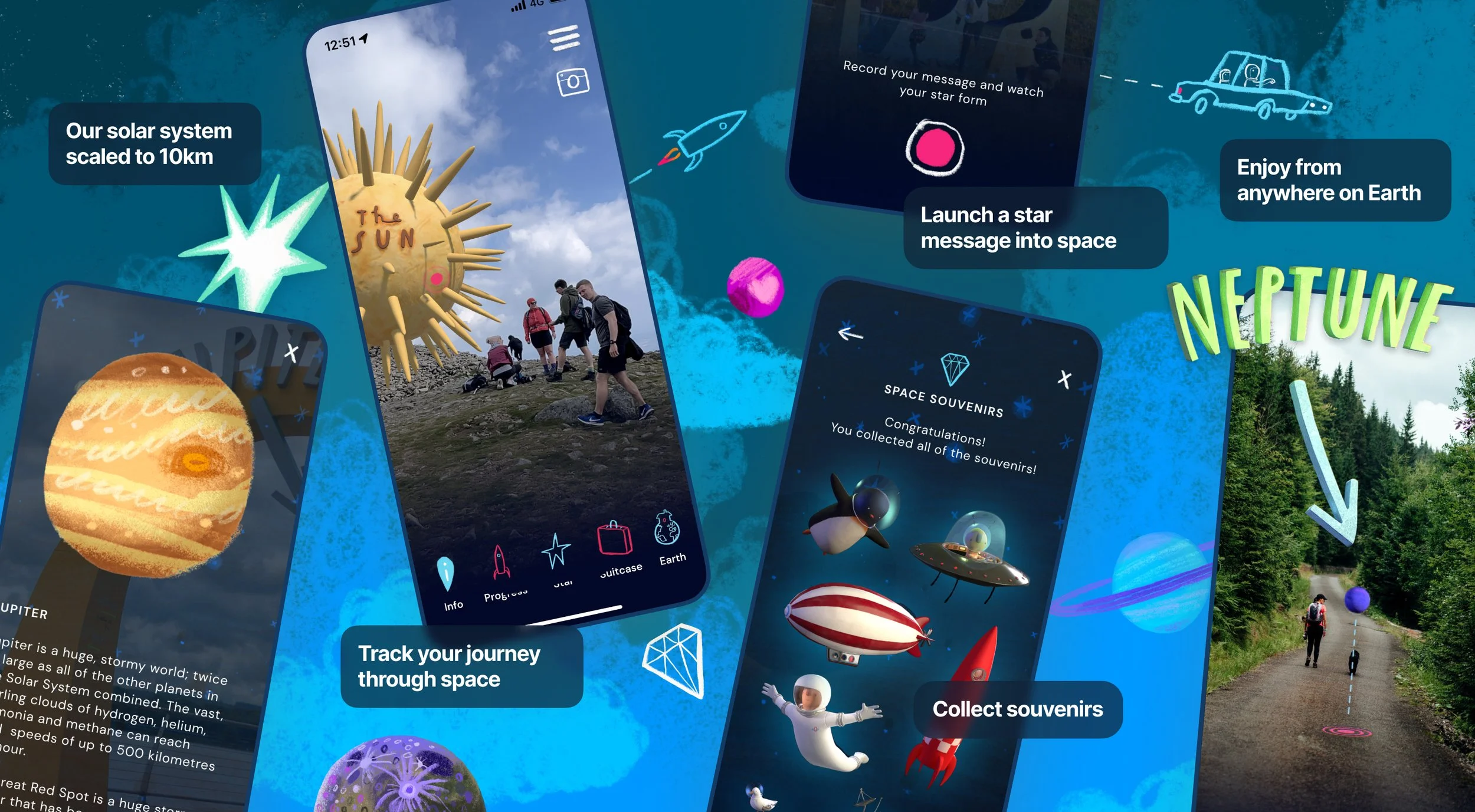 Our challenge was to enhance a 10km-long sculpture trail, featuring scale models of planets, by integrating AR technology. The project's central idea was to explore the insignificance of earthly divisions when viewed from the cosmic perspective. The goal was to create an experience that encouraged users to appreciate the vastness of space while keeping their feet on the ground.